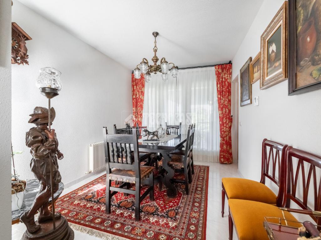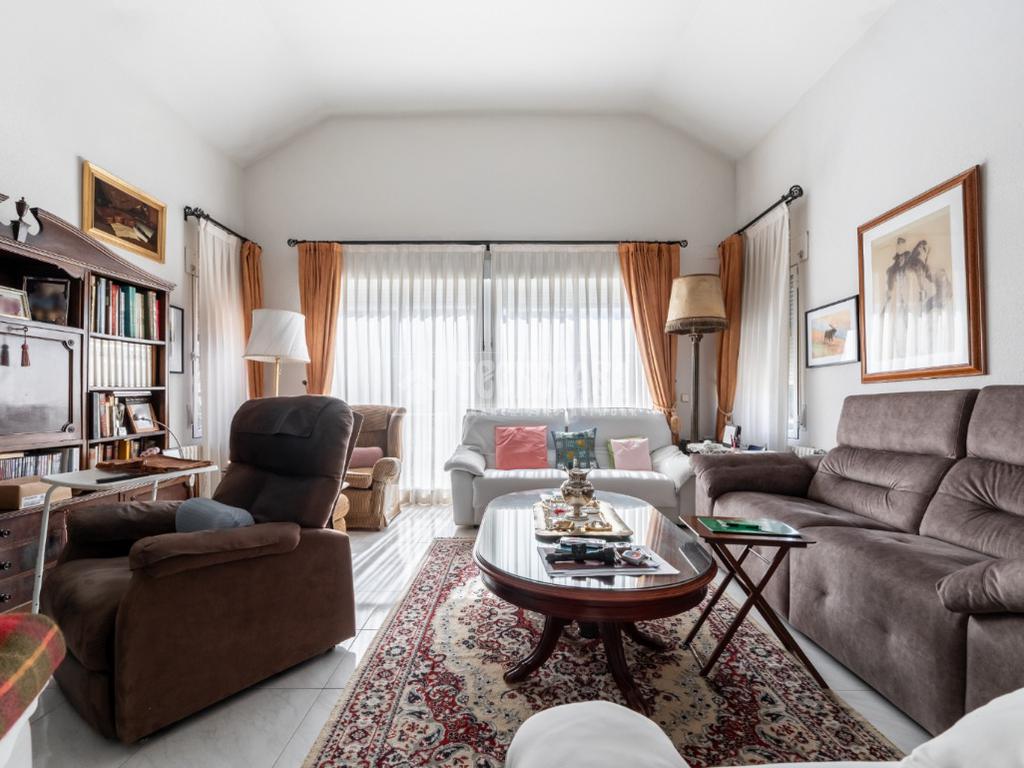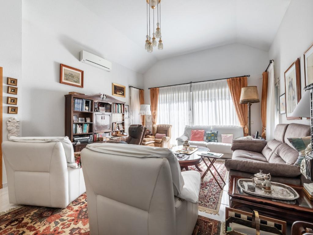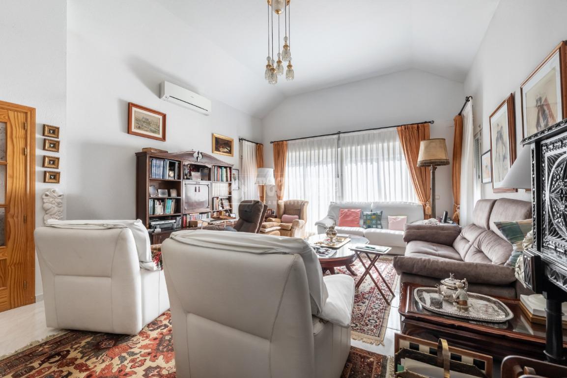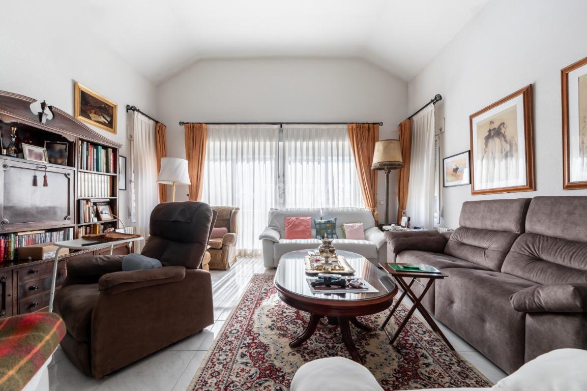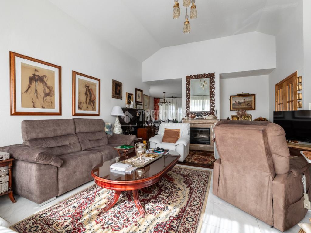 El gran salón, destaca por sus ventanales que inundan el espacio de luz natural durante todo el día, sus altos techos de casi 5 metros de altura y una gran chimenea de mármol. Desde el mismo salón se accede a la zona de comedor, también amplia y dotada de ventanales con vistas a la parcela del chalet y con acceso directo a la cocina, de generosa dimensiones y cómoda distribución.