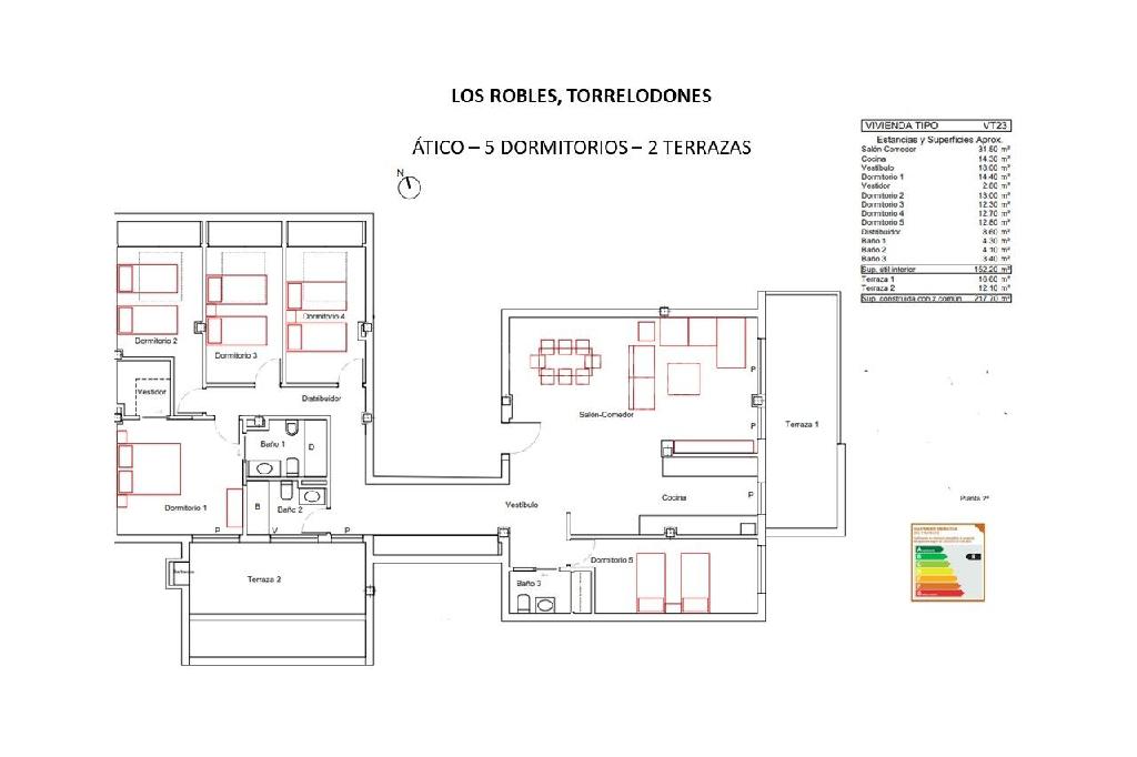 Tiene cinco amplios dormitorios, cuatro de ellos con armarios empotrados y ventanas Velux con apertura y cierre por domótica, lo que aporta luz natural y un excelente aprovechamiento del espacio.