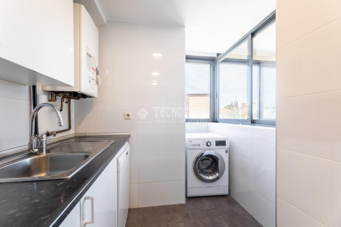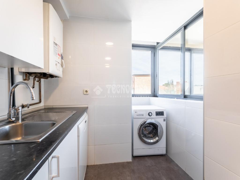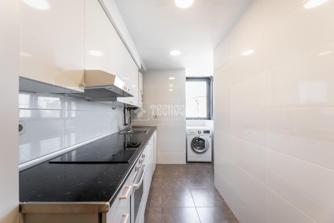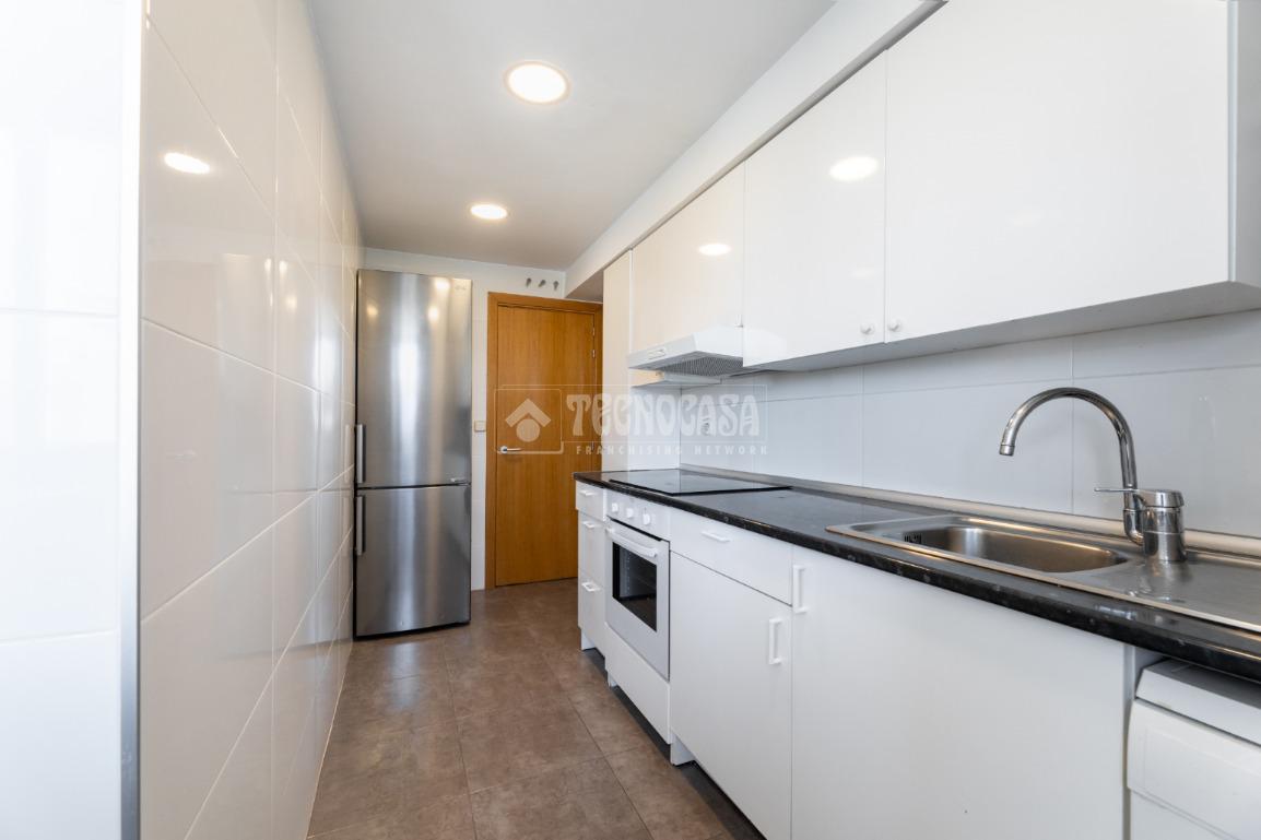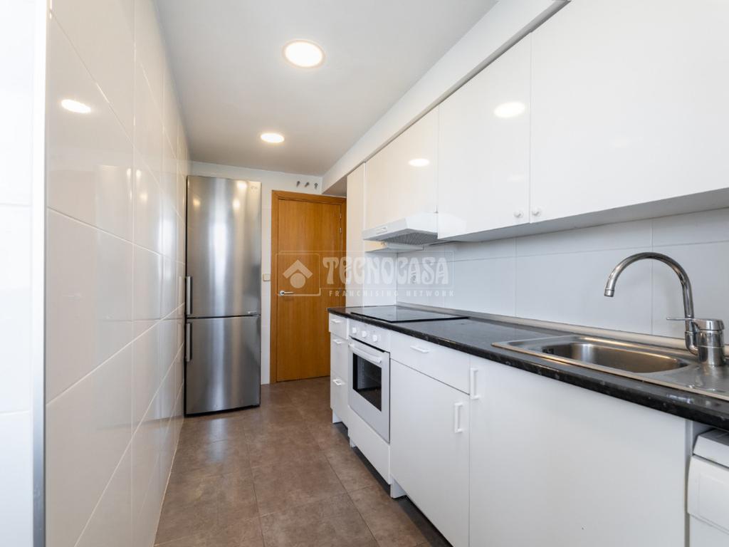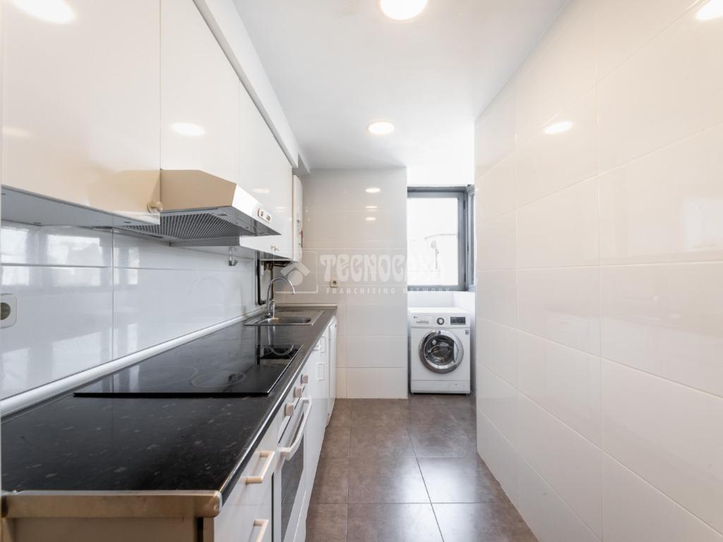 La cocina, cómoda y funcional, se integra visualmente con el salón a través de una amplia ventana, lo que permite la entrada de abundante luz natural.